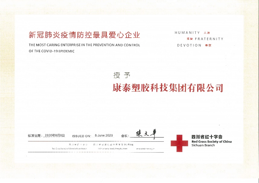 2020.11康泰集團(tuán)榮獲四川省“新冠肺炎疫情防控最具愛心企業(yè)”稱號(hào)近日,為表彰康泰塑膠科技集團(tuán)在新冠疫情防控工作中的突出貢獻(xiàn),四川省紅十字會(huì)授予集團(tuán)“新冠肺炎疫情防控最具愛心企業(yè)”榮譽(yù)稱號(hào)。2020年1月,正當(dāng)全國人民喜迎新春佳節(jié)時(shí),一場突如其來的新型冠狀病毒肺炎疫情肆虐中華大地。面對(duì)新型冠狀病...閱讀人數(shù):8034 -