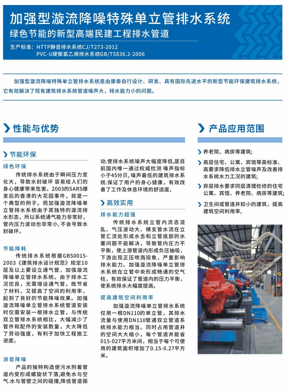加強型漩流降噪特殊單立管排水系統(tǒng)是由康泰自行設(shè)計、研發(fā)、具有國際先進(jìn)水平的新型節(jié)能環(huán)保建筑排水系統(tǒng)。它有效解決了現(xiàn)有建筑排水系統(tǒng)管道噪聲大,排水能力小的問題。