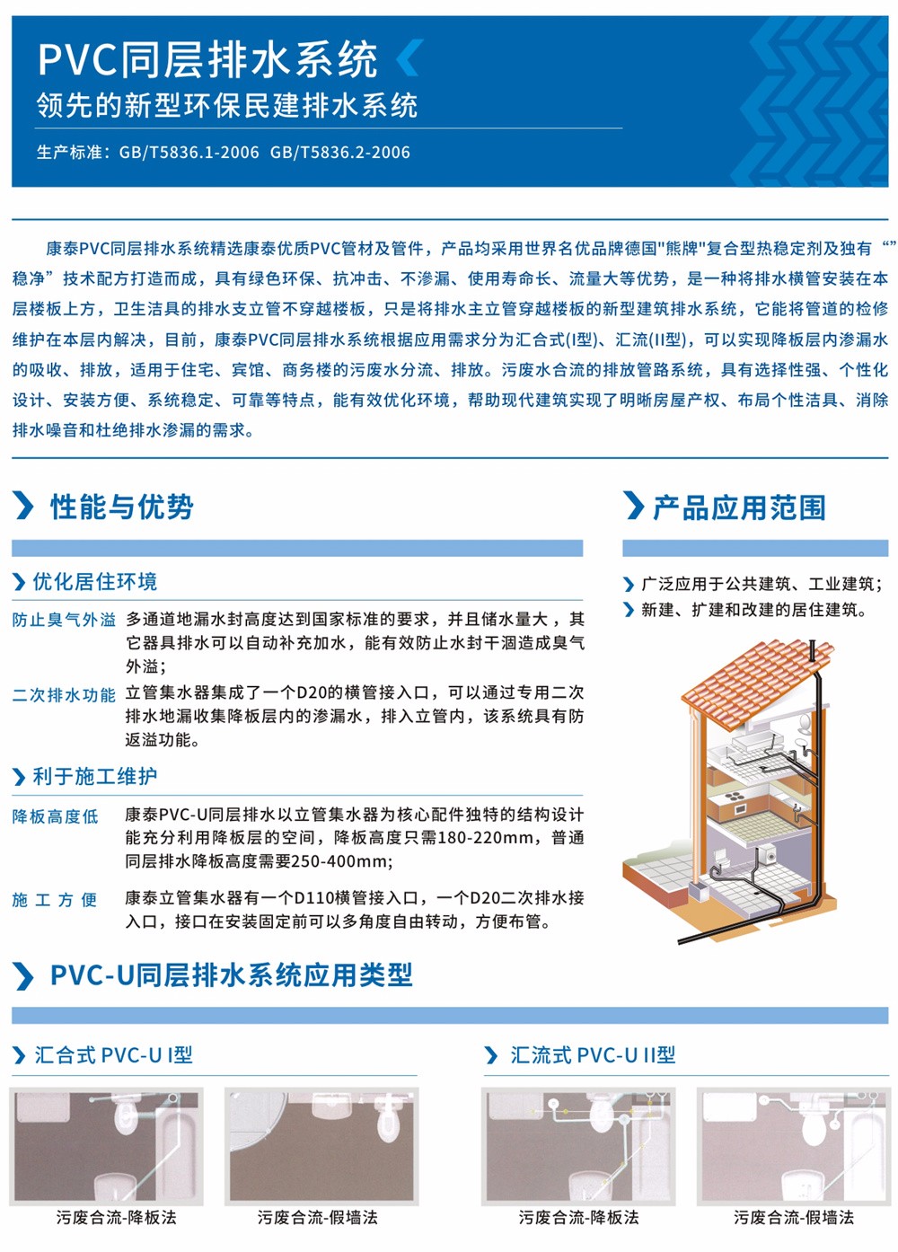 康泰PVC同層排水系統(tǒng)精選康泰優(yōu)質PVC管材及管件,產(chǎn)品均采用世界名優(yōu)品牌德國“熊牌”復合型熱穩(wěn)定劑及獨有“穩(wěn)凈”技術配方打造而成 ,具有綠色環(huán)保、抗沖擊、不滲漏、使用壽命長、流量大等優(yōu)勢,是一種將排水橫管安裝在本層樓板上方,衛(wèi)生潔具的排水支立管不穿越樓板,只是將排水主立管穿越樓板的新型建筑排水系統(tǒng),它能將管道的檢修維護在本層內解決。目前,康泰PVC同層排水系統(tǒng)根據(jù)應用需求分為匯合式(I型)、匯流式(Ⅱ型),可以實現(xiàn)降板層內滲漏水的吸收、排放,適用于住宅、賓館、商務樓的污廢水分流、排放,污廢水合流的排放管路系統(tǒng),具有選擇性強、個性化設計、安裝方便、系統(tǒng)穩(wěn)定、可靠等特點,能有效優(yōu)化環(huán)境,幫助現(xiàn)代建筑實現(xiàn)了明晰房屋產(chǎn)權、布局個性潔具、消除排水噪音和杜絕排水滲漏的需求。